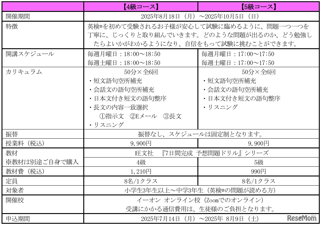 英会話教室を運営するイーオンは、2025年10月5日に行われる英検に初めて挑戦する子供向けに、オンライン校のキッズクラスで「はじめての英検4級・5級対策コース」を開講する。英語学習の重要性が高まる中、イーオンは資格取得を目指す子供たちをサポートするための新たな取組みを開始する。申込期限は8月9日。
