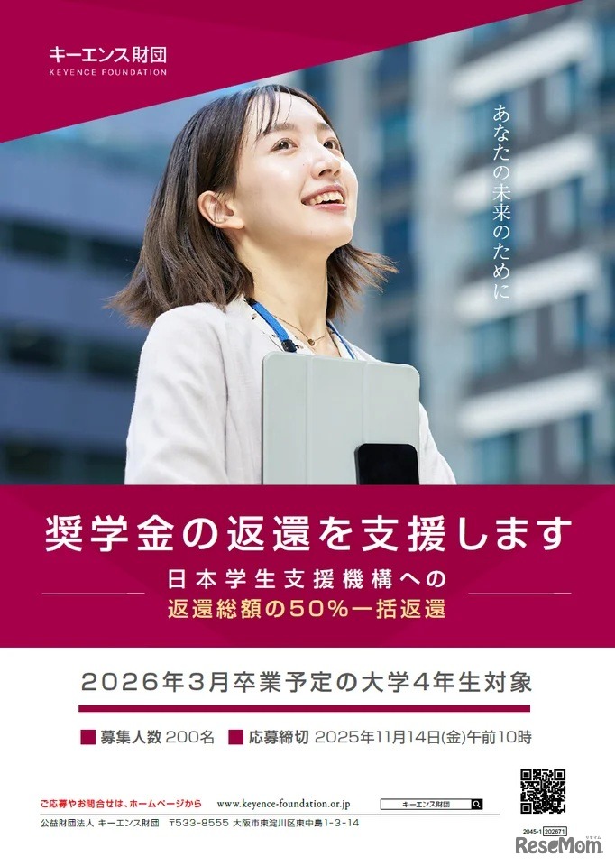 キーエンス財団は、2026年3月に卒業を控えた大学4年生を対象に「貸与奨学金の返還支援」の募集を開始した。この制度は、大学を卒業する学生に代わり、キーエンス財団が日本学生支援機構(JASSO)に対して奨学金の返還を行う。申込期限は、2025年11月14日午前10時。