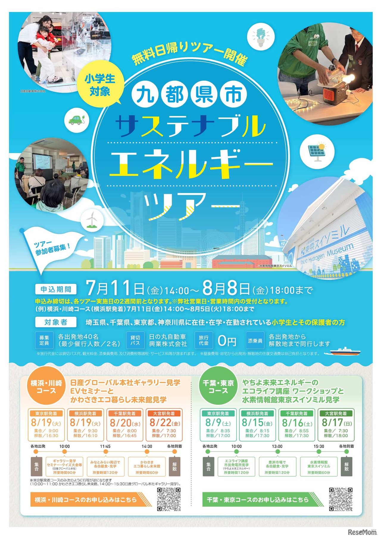 九都県市(埼玉県、千葉県、東京都、神奈川県、横浜市、川崎市、千葉市、さいたま市、相模原市)では、次世代を担う小学生とその保護者を対象に、再生可能エネルギー関連施設などで体験イベントに参加するサステナブルエネルギーツアーを実施する。参加費無料。各ツアー実施日の2週間前までにWebサイトより申し込む。