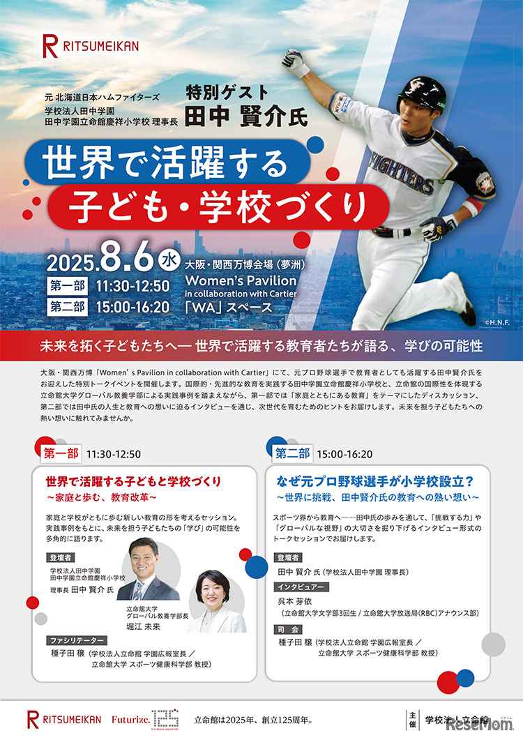 立命館大学は2025年8月6日、北海道日本ハムファイターズ、メジャーリーグで活躍した田中賢介氏によるスペシャルトークイベントを大阪・関西万博会場で開催する。現在は田中学園立命館慶祥小学校の理事長を務める田中氏が教育について熱く語る。予約・抽選制。