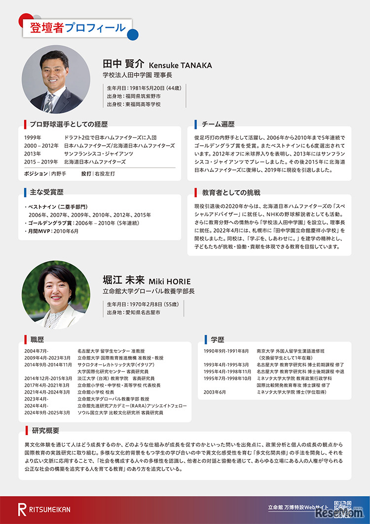 立命館大学は2025年8月6日、北海道日本ハムファイターズ、メジャーリーグで活躍した田中賢介氏によるスペシャルトークイベントを大阪・関西万博会場で開催する。現在は田中学園立命館慶祥小学校の理事長を務める田中氏が教育について熱く語る。予約・抽選制。