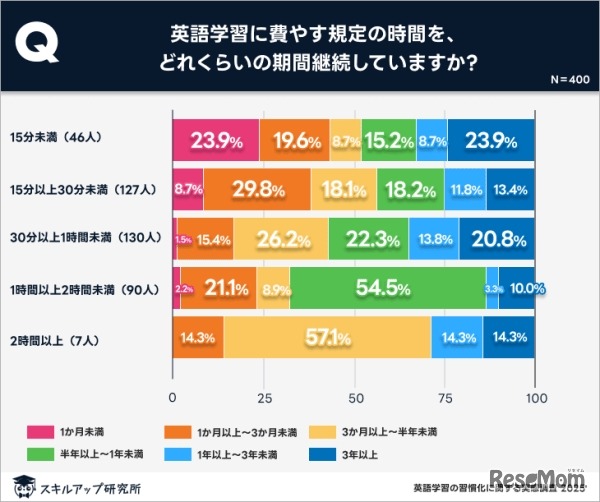 画像出典:スキルアップ研究所「英語学習の習慣化に関する実態調査」 1日平均30分~2時間の学習時間がもっとも習慣化しやすい