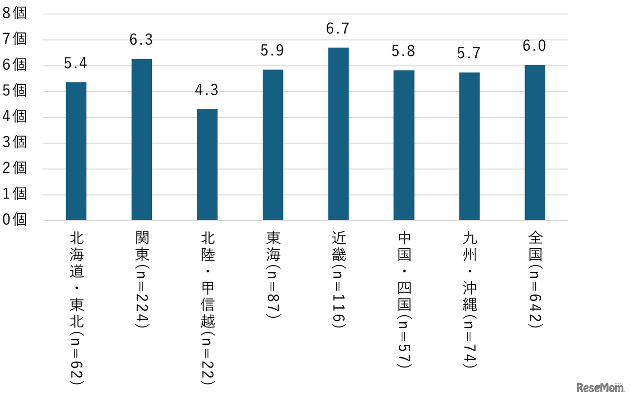小中学生:スマホに関する親と子のルール 決めている個数(地域別・複数回答)