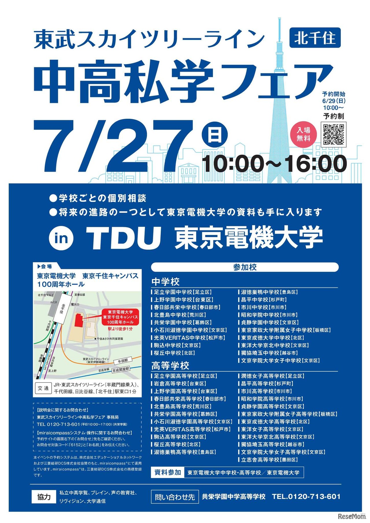 東武スカイツリーライン沿線の私立校が集まる「中高私学フェア」が、2025年7月27日に東京電機大学の東京千住キャンパスで開催される。各校の個別相談や資料配布のほか、相談コーナーも設ける。入場無料、事前予約制。ミライコンパスより時間帯を選択して申し込む。