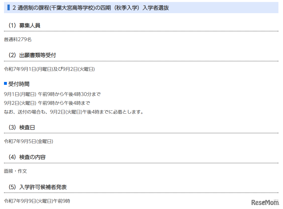 千葉県教育委員会は2025年7月22日、10月からの秋季入学のための三部制の定時制の課程と通信制の課程の選抜日程や検査内容を発表した。三部制の定時制の課程は、8月19日・20日に出願を受け付け、8月22日に検査、通信制の課程は9月1日・2日に出願を受け付け、9月5日に検査を実施する。
