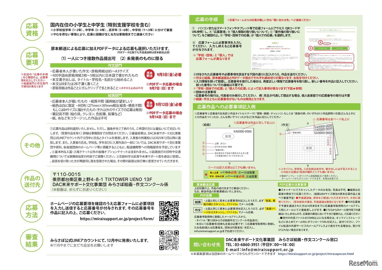 DAC未来サポート文化事業団は、小中学生を対象に「第13回みらさぽ絵画・作文コンクール」を実施する。テーマは「家族の絆」または「冒険・挑戦・チャレンジ」。締切りは作文が2025年9月5日、絵画が9月12日必着。受賞者には北海道、東京、大阪の親子旅行も。