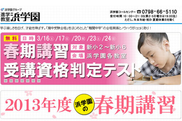 浜学園は、新小学2年生から新小学6年生の塾外生を対象とした「春期講習受講資格判定テスト」を実施する。期間は3月16日-24日の土、日、祝5日間で、37教室で開催。受験料は無料だ。