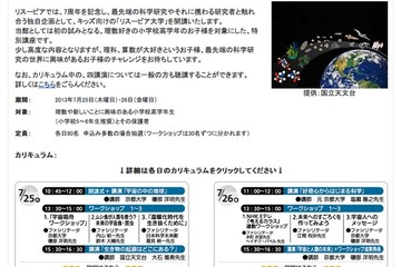 パナソニックセンター東京は7月25日(木)と26日(金)に、小学生が科学研究や研究者とふれあう特別企画「リスーピアキッズ大学」を開講する。対象は理数や新しいことに興味のある小学校高学年生とその保護者で、参加費は無料。