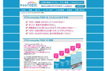 オンライン学習教材のすららネットは、オリジナル開発によるTOEIC対策「すらら everyday TOEIC」の「600点コース」の提供を10月1日より開始した。対象年齢は問わず、3日間の無料トライアルも実施している。