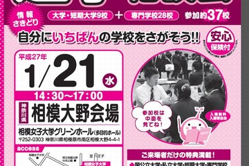 進路支援情報センターのさんぽうは、来年1月21日に新高校3年生、新高校2年生などを対象にした「進学相談会」を相模女子大学で開催する。大学、短期大学、専門学校が37校参加する。入場無料。