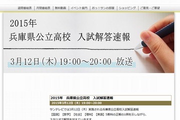 兵庫県公立高校入試が3月12日に行われている。サンテレビでは、入試当日の19時より入試解答速報を放送する。兵庫県教育委員会によると、全日制の出願倍率は1.10倍で、出願倍率がもっとも高いのは、有馬(人と自然)1.95倍であった。