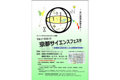 京都府は、独創的な科学研究ができる人材の育成を目指した平成27年度第1回「京都サイエンスフェスタ」を6月14日、京都大学百年記念ホールなどで開催する。サイエンスネットワーク京都校の府立高校9校が参加し、取り組んできた研究成果を発表する。