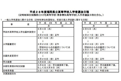 福岡県は6月9日、平成28(2016)年度福岡県立高等学校入学者選抜日程について発表した。福岡県立高校の推薦入試は平成28年2月8日および9日に、一般入試の学力検査は3月8日に実施する。