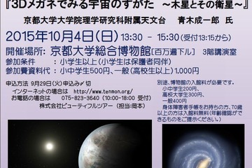 「第22回京都千年天文学街道アストロトーク」が10月4日、京都大学総合博物館で開催される。対象は小学生以上。「天文学講演」と3Dメガネで宇宙の姿を解説する「4次元宇宙シアター」を組み合わせたイベントだ。