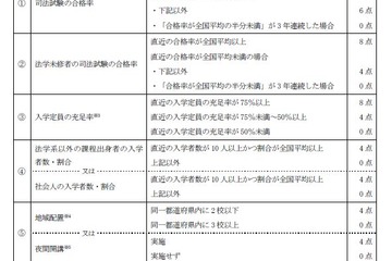 文部科学省は9月17日、平成28年度の「法科大学院公的支援見直し加算プログラム」の基礎額算定率設定にあたっての類型一覧を公開した。司法試験合格率や入学定員充足率などを基に評価し、最高ランクには東大や京大など13大学が分類された。