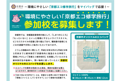 京都市は、2016年9月~2017年3月末までに修学旅行で京都市内に宿泊する学校を対象に、環境にやさしい取組みを実行する「京都エコ修学旅行」の参加校を募集する。参加校の修学旅行生には、先着2万名に買い物時などに使用できるオリジナルエコバックを進呈する。