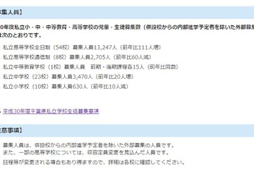 千葉県総務部学事課は9月12日、平成30年度(2018年度)千葉県私立学校生徒募集要項を発表した。募集人員は前年と比べ、私立中学校が20人増、私立高校全日制が111人増となる。