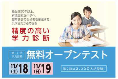 浜学園は11月18日・19日に、塾生ではない小学1~5年生対象の「第3回学力診断無料オープンテスト」を実施する。厳選分野から作成されたテストで自分の弱点分野を発見できるほか、テストの解説動画が無料でWeb配信され復習にも役立つ。会場は浜学園全40教室。