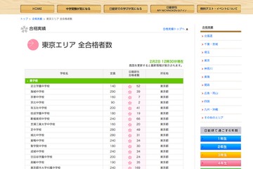 四谷大塚は1月9日、2012年合不合判定テスト最終資料として「2013年入試最終予想Part2」を発表した。1月7日21時現在の埼玉県と千葉県の私立中学校の出願状況や2013年首都圏中学入試の状況についてまとめられている。