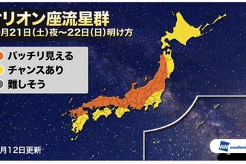 オリオン座流星群が見頃を迎える10月21日夜~22日明け方は、西日本や東日本を中心に流星観測が期待できる天気だとウェザーニューズが発表した。21日夜には流星特別番組で、ハワイ島から流星群のようすを生中継する。