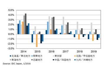 IT専門調査会社IDC Japanは、国内IT市場の2015年~2019年の地域別予測を発表した。2015年の国内IT市場は、円安の影響により大都市圏とそれ以外の地域での格差が量的、質的両側面において広がっているという。