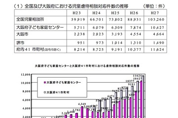 大阪府は11月24日、平成27年度の「大阪府子どもを虐待から守る条例第9条に基づく年次報告書」を公表した。大阪府子ども家庭センターにおける児童虐待相談対応件数は10,427件となり、前年度に比べ2,553件増。条例の特徴である「48時間以内の安全確認」は8,277件実施された。