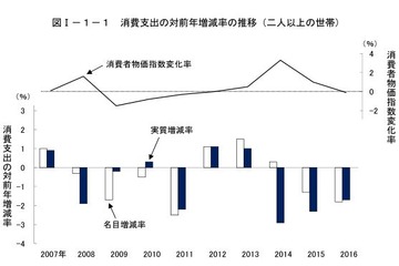 総務省は2月17日、家計調査報告として平成28年平均速報を公表した。2016年の2人以上の世帯の消費支出は、1世帯あたり1か月平均28万2,188円と3年連続で実質減少。教育の月平均額は1万1,310円で、実質1.3%増加となった。