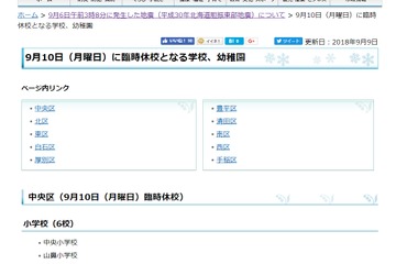 北海道胆振東部地震により、札幌市や日高町などの一部の小中学校は2018年9月10日を臨時休校とする。札幌市立の学校320校のうち90校が臨時休校する。また、函館市や千歳市、北広島市、恵庭市などの学校は午前授業とする。