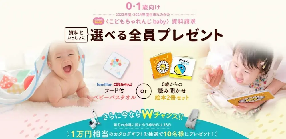 | 資料請求 | 0・1歳 選べる全員プレゼント | フード付きベビーバスタオル or 読み聞かせ絵本2冊セット |