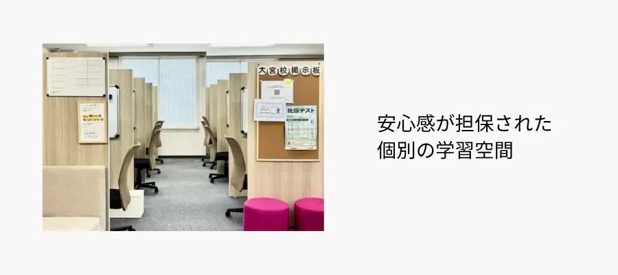 | 教室の雰囲気 | パーテーションで区切られた個別ブースを用意しています。落ち着いた雰囲気の中で勉強していただけます。 |
