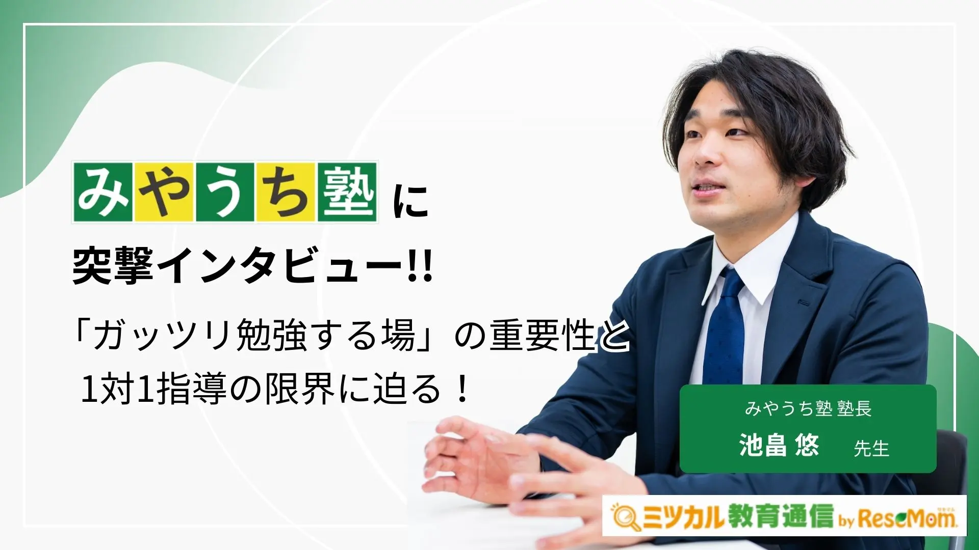 小・中学生を対象とした「みやうち塾」の塾長・池畠 悠先生は、大手塾と個別指導塾の両方で経験を積んだ末に、「中堅層の生徒を確実に伸ばす」という明確なビジョンを持って独立されました。