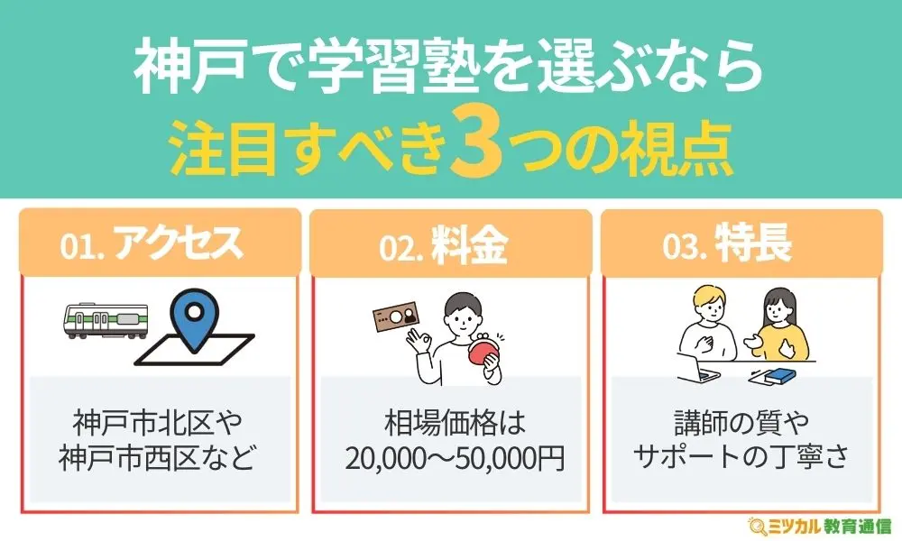 ミカ先生神戸の学習塾選びに失敗しないためにも、ぜひ下記の3つのポイントを意識して学習塾を選ぶようにしましょう。