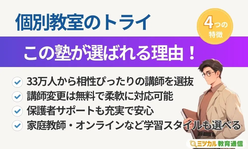 また、個別指導形式の場合、学習者と講師の相性が非常に重要になるので、学習者が満足する講師に巡り合うまで講師チェンジができる学習塾を選ぶようにしましょう。