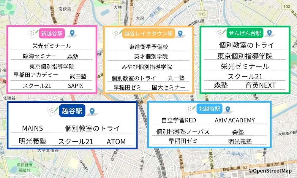 また、越谷駅エリアは越谷市の中でも学習塾が多く集まっている地域なので、学習者に最適な教室がみつけやすい地域と考えられるでしょう。