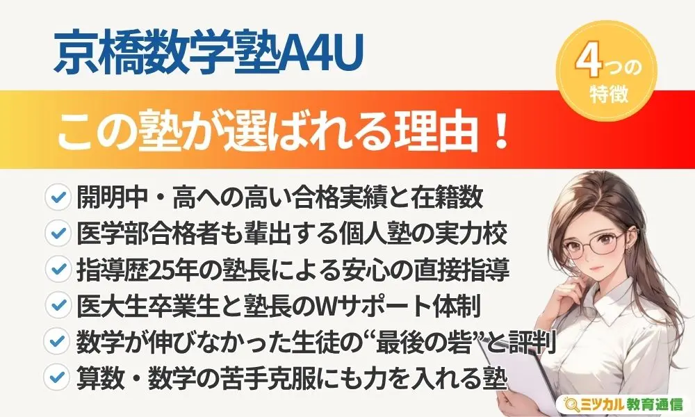 また、難関大学の合格実績があり数学学習に特化した学習塾「京橋数学塾A4U」も、学習スタイルや学習カリキュラムが合うお子さんならば、大学合格を実現することができるでしょう。