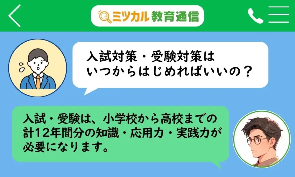 入試・受験は、小学校から高校までの計12年間分の知識・応用力・実践力が必要になります。