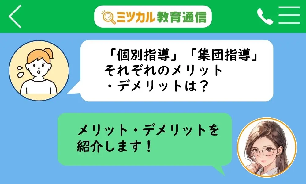 「個別指導」のメリットは学習者に合わせて学べる点、デメリットは料金が比較的高い点です。
