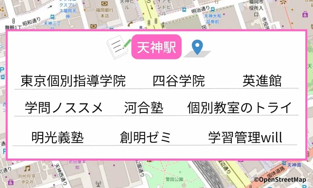 今回ご紹介した塾もほとんどが天神駅から徒歩10分以内に教室があります。