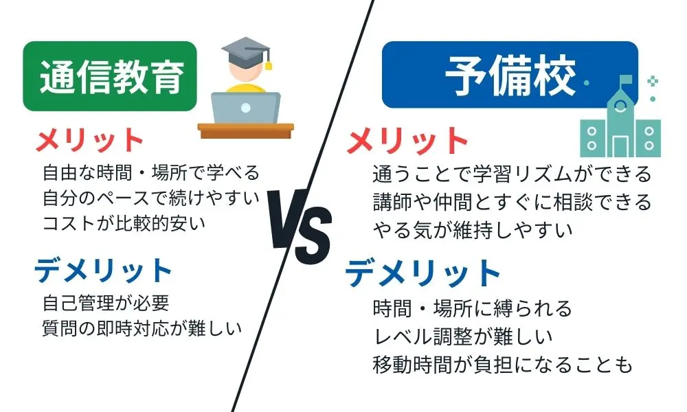 予備校と通信教育には、それぞれ異なるメリット・デメリットがあります。
