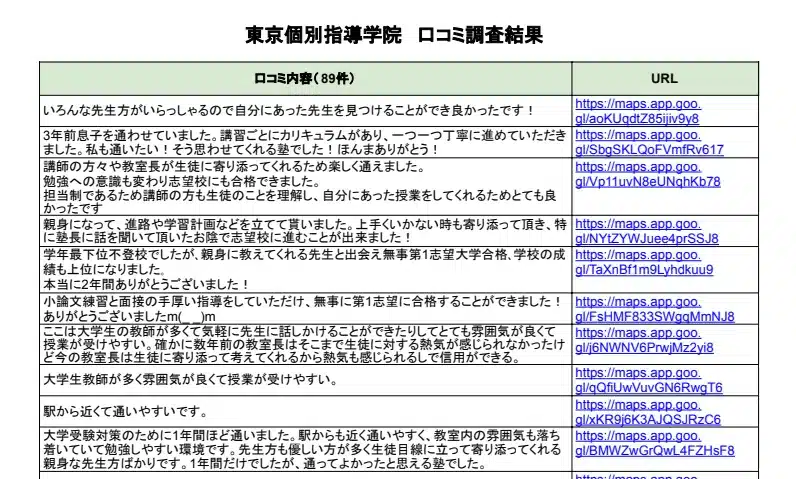東京個別指導学院の口コミ89件を調査すると、子どもに合わせた指導、講師との相性の見極め、振替や面談のしやすさを評価する声が見られました。