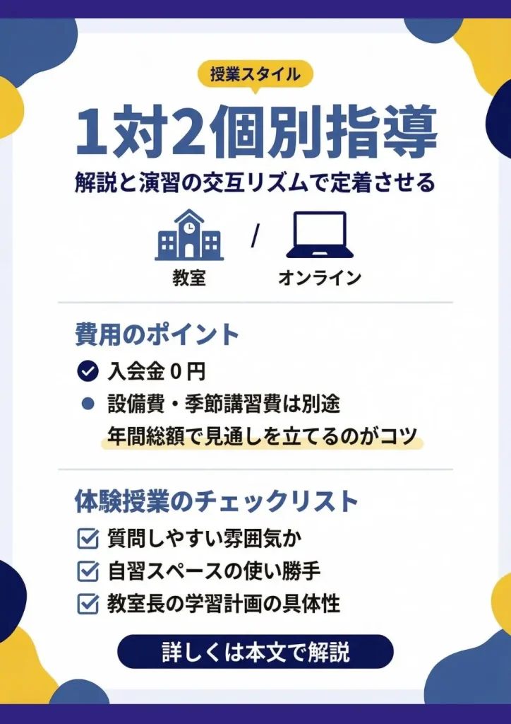 部活や体調不良などで予定が変わることの多い家庭や、授業だけでなく保護者への対応まで丁寧に見ておきたい家庭には、なじみやすい塾です。