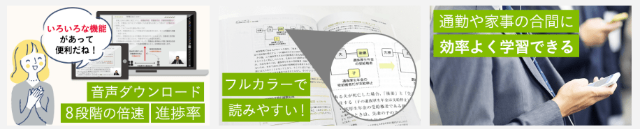 1日2時間の勉強時間をしっかり確保するのは難しい人向けに、講義動画のダウンロードやデジタルブックなどeラーニング教材も提供しています。