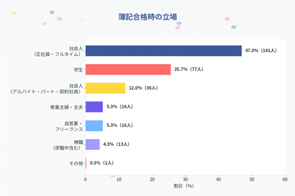 今回のアンケートにご協力いただいた300人の「簿記合格当時の立場」について伺いました。回答結果は以下の通りです。
