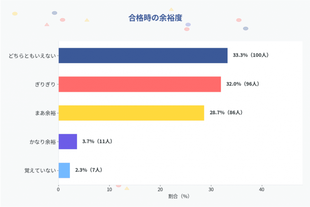 「合格はどれくらい余裕でしたか?」と質問したところ、回答結果は以下の通りです。