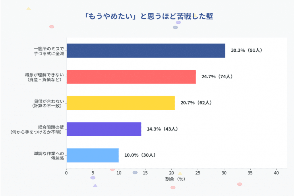 「貸借が合わない」(20.7%)は、何時間計算しても答えが出ない状況の精神的消耗を示しており、5つの壁はそれぞれ異なる性質(計算ミスの連鎖・概念理解・作業疲弊など)を持ち、簿記の勉強が多面的に難しいことを示しています。