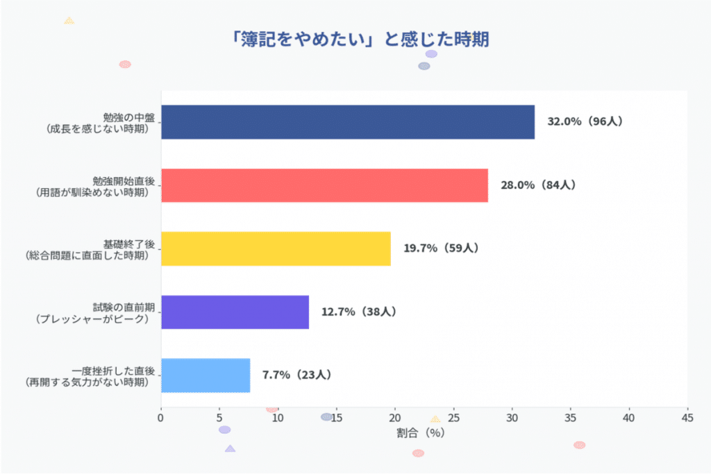 「勉強開始直後」(28.0%)も多く、簿記特有の用語・概念(借方・貸方、資産・負債など)への最初の壁の大きさを示しています。