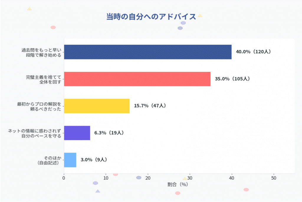 第四に、合格者が当時の自分に贈るアドバイスの1位は「過去問を早期に始める」(40.0%)、2位は「完璧主義を捨てる」(35.0%)であり、これらは乗り越え方の上位回答とも一致しています。