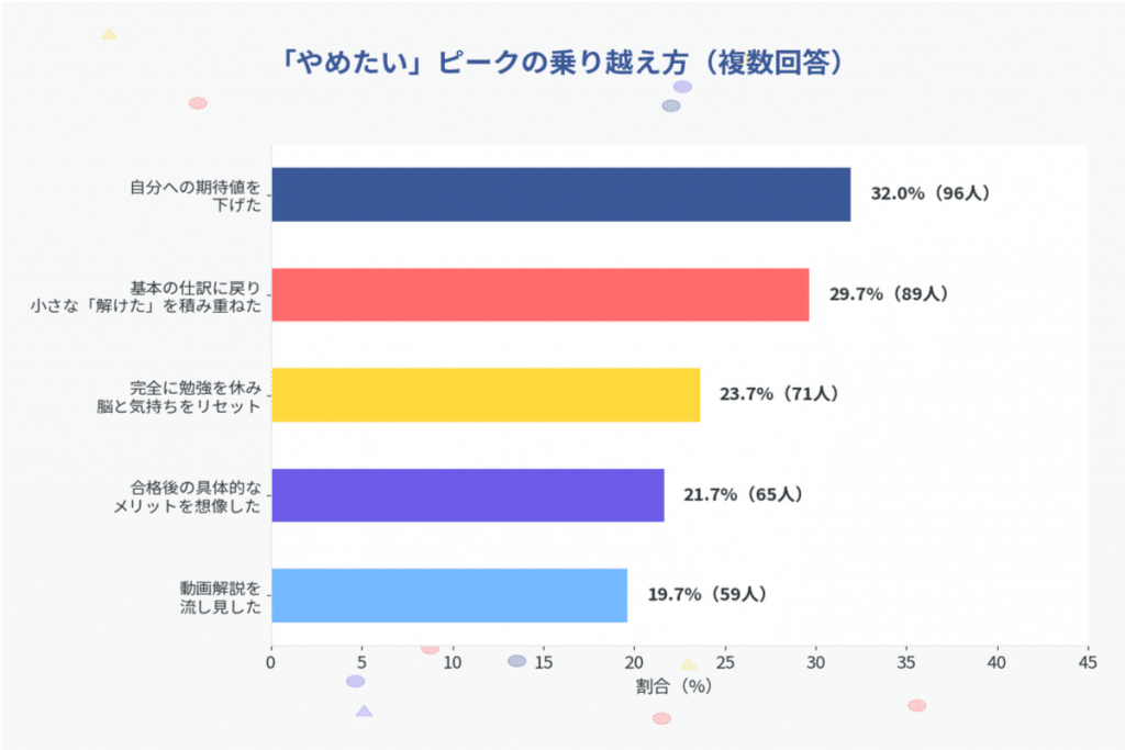 「完全に休む」(23.7%)は、無理に続けるよりも一時的な休息がかえって効果的であることを示しており、「合格後のメリットを想像する」(21.7%)は、目標の具体化がモチベーション維持に有効であることを示しています。