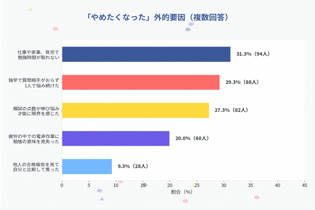「独学で質問相手がいない孤独感」(29.3%)が2番目に多く、独学者の割合が高い(58.0%)ことと連動しています。「模試の点数が伸びない」(27.3%)は、努力が結果に結びつかない焦りが継続意欲を削ぐことを示しています。
