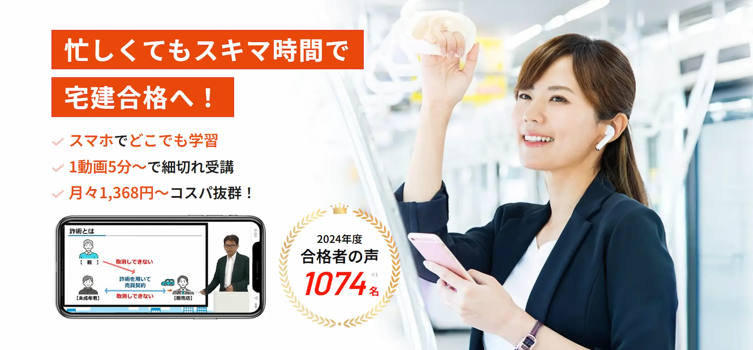 スタディング宅建講座は、スマホ1台で宅建の勉強ができる講座。動画講義が中心で、通勤中や仕事の昼休憩、家事のスキマ時間でも学べます。